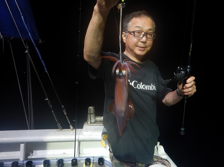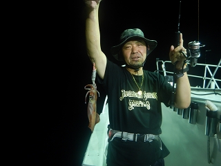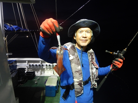 日の有る時間帯から60mの棚で釣れ始めました、集魚灯が効きはじめベイトが寄り出すと50mで好調に釣れ出し、アオリイカはさっぱり姿が見えずこれは後半に期待、10時頃失速が有りましたが終盤に連発